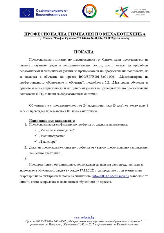 Професионална гимназия по механотехника гр. Сливен кани представители на бизнеса, научните среди и неправителствения сектор, които желаят да придобият педагогически и методически умения за преподаватели по професионална подготовка, да се включат в обучение по проект BG05SFPR001-3.001-0001 „Модернизиране на професионалното образование и обучение“, поддейност 5.2. „Менторски обучения за придобиване на педагогически и методически умения за преподаватели по професионална подготовка (ПП), външни за образователната система“.